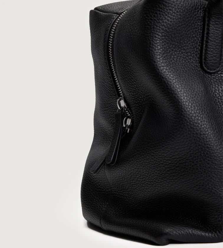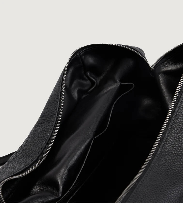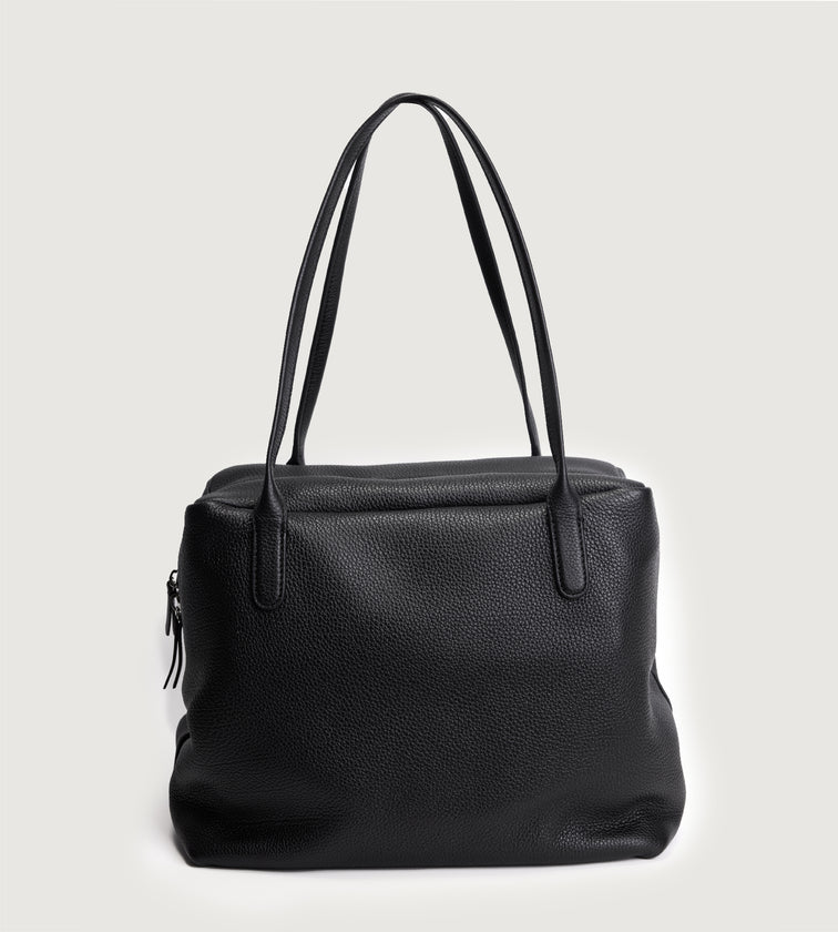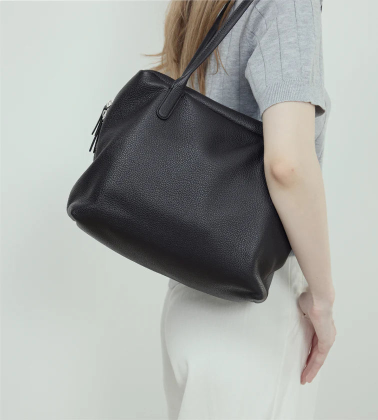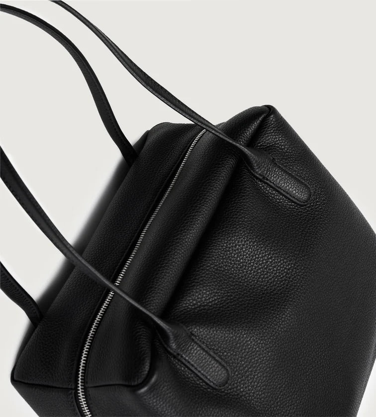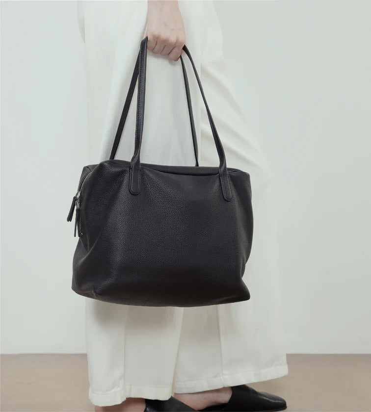 A minimalist shoulder bag crafted in imported full-grain leather with natural tumble finish. Each piece carries unique grain patterns, with supple leather that becomes softer and more lustrous over time. Its rectangular base and tubular handles create a sharp, refined silhouette, free from overt logos—inviting the wearer to define their own style. A pure expression of discreet luxury.