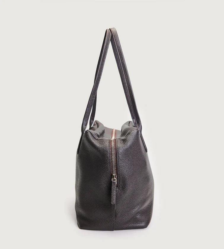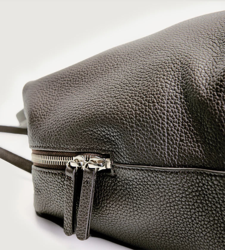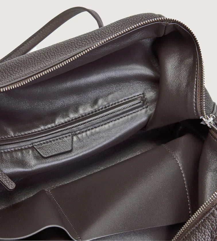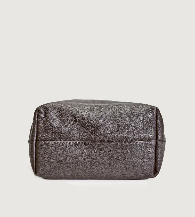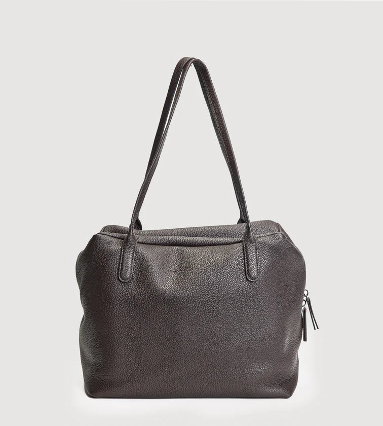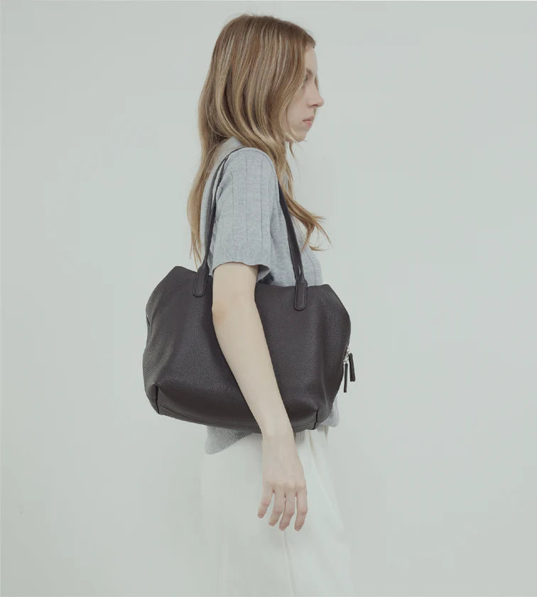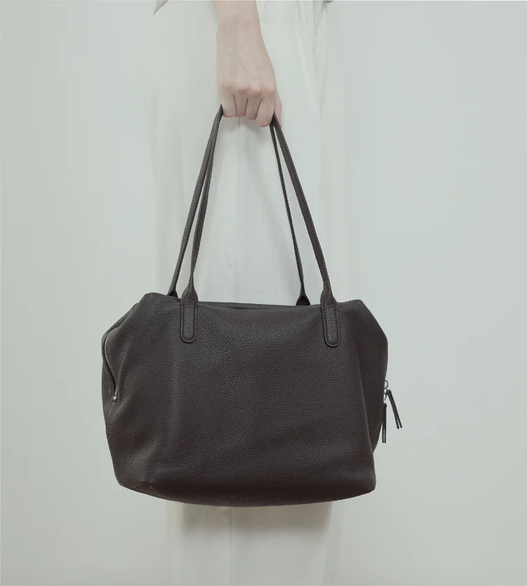 A minimalist shoulder bag crafted in imported full-grain leather with natural tumble finish. Each piece carries unique grain patterns, with supple leather that becomes softer and more lustrous over time. Its rectangular base and tubular handles create a sharp, refined silhouette, free from overt logos—inviting the wearer to define their own style. A pure expression of discreet luxury.