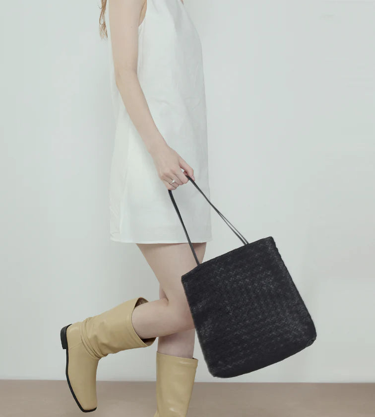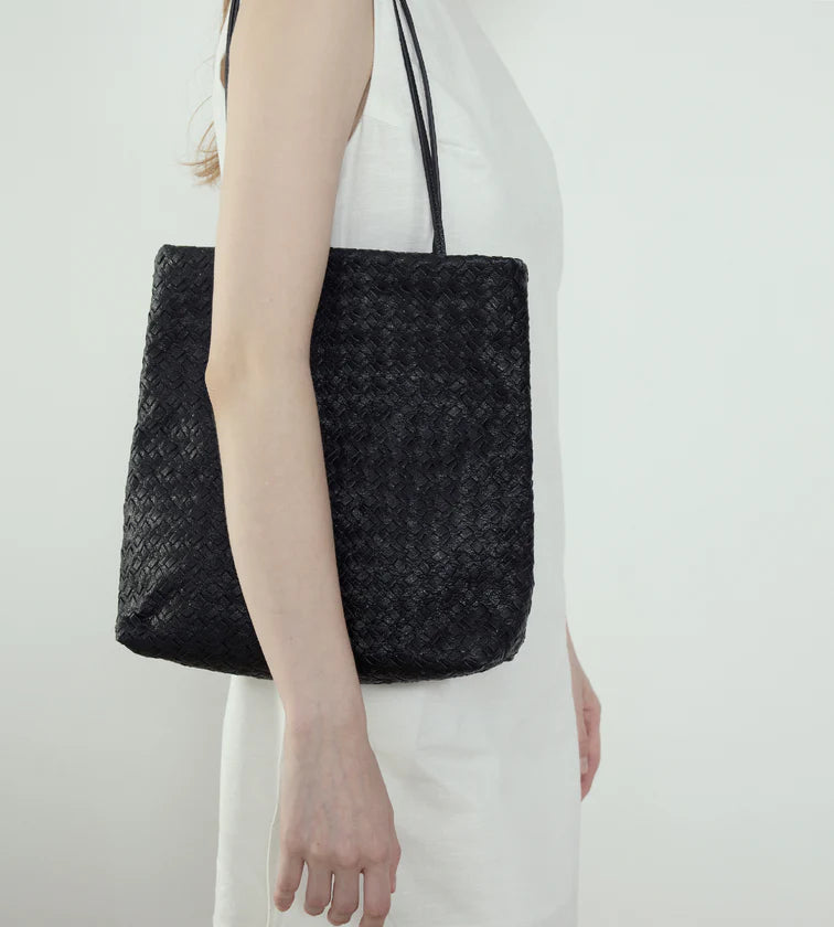 A tote that embodies intellectual elegance through minimalist lines and intricate hand-weaving. Its structured silhouette conveys confidence, while soft goat leather expresses a subtle, refined femininity. Compact yet spacious, it is ideal for city commutes and daily use.