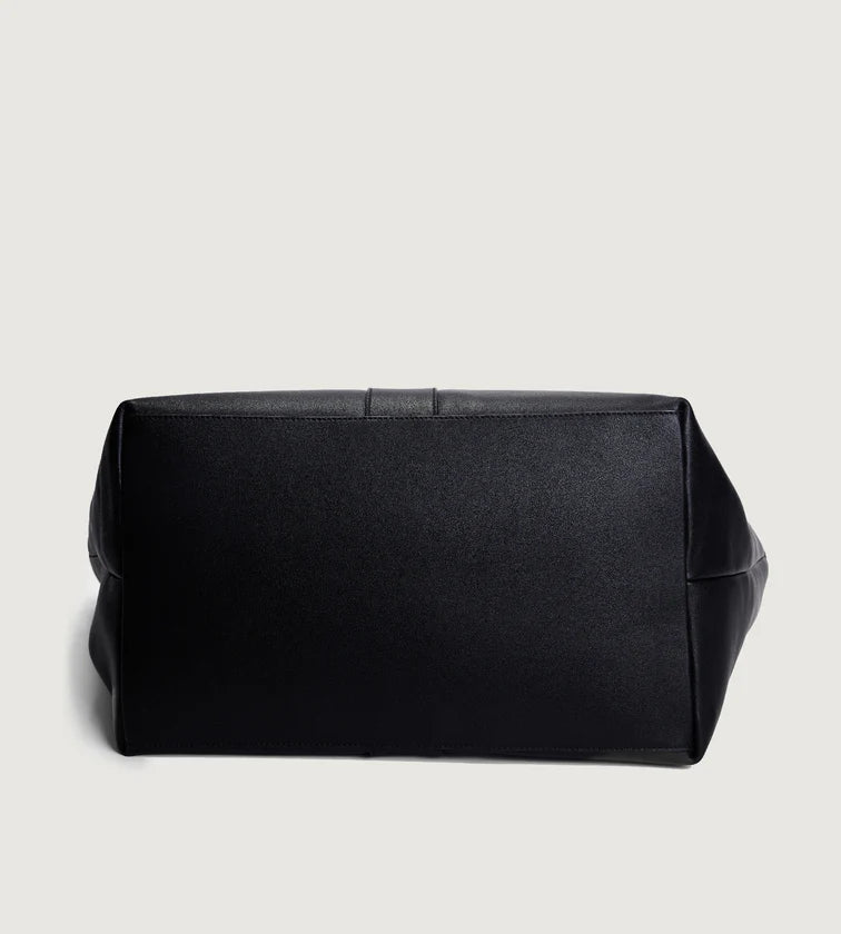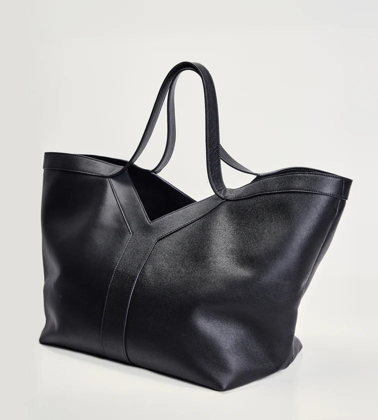 This is a handcrafted tote bag in premium full-grain leather, offering generous capacity and inspired by the refined Y-shaped aesthetic found in couture house archives. Its silhouette is gracefully structured, while the cut-out handles add a subtle